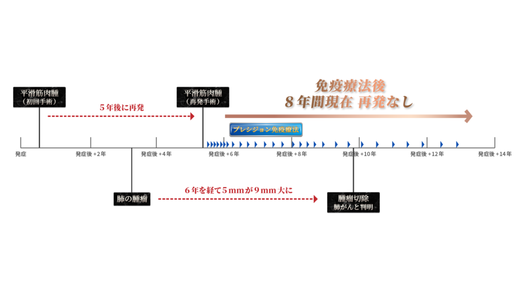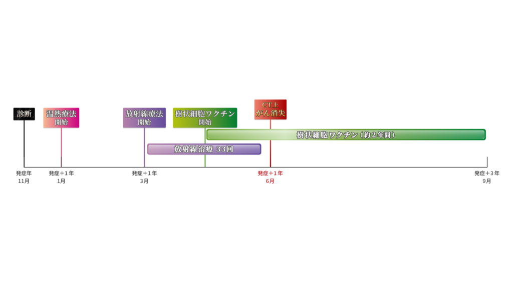 全て 悪性リンパ腫 肉腫 膵臓がん 肛門がん 大腸がん 膀胱がん 胆道がん(胆管がん・胆嚢がん) 脳腫瘍 胃がん 食道がん 胸腺がん 肺がん 頭頸部がん 乳がん 卵巣がん 子宮体がん 前立腺がん 治療実績 症例8 大腸がんステージ4、肝臓を覆い尽くす巨大な転移の消失、主治医、放射線科医も驚く 治療実績 症例1 膀胱癌ステージ4の患者さま。抗がん剤の効果がなく、プレシジョン免疫療法を開始したところすべての転移が消失、腫瘍マーカーも正常化しました。 治療実績 症例5 子宮平滑筋肉腫(再発)、8年間再々発なし 治療実績 症例16 膵臓がんステージ4、当グループが目指す(理想とする)膵臓がん治療プランと経過 治療実績 症例1 肛門管がんステージⅢ、手術・抗がん剤治療は行わず、免疫療法+放射線治療のみで長期安定 治療実績 症例15 30代の患者さま、膵臓がんステージⅢからの克服 治療実績 症例2 前立腺がんステージ4、ホルモン治療+プレシジョン免疫療法で6年間良好にコントロール中 治療実績 症例6 乳がんステージ4、余命半年宣告からの5年お元気